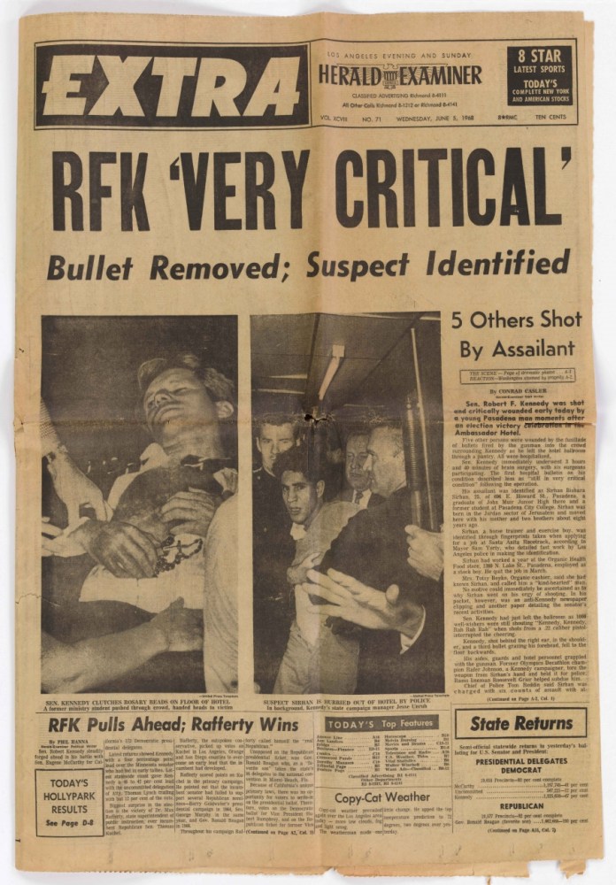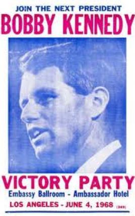 On June 5, 1968, a few minutes after midnight, Robert Kennedy was shot and killed at the Ambassador Hotel in Los Angeles while walking through a narrow serving area called "the pantry." Kennedy had just won the California primary and was on his way to a room where print media reporters were waiting to hear him speak.