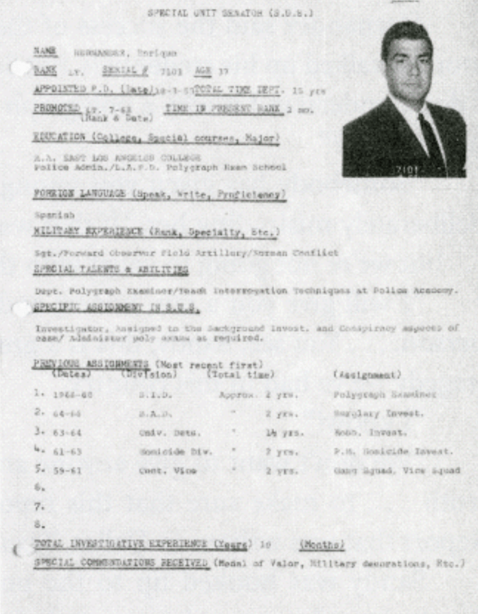 To help oversee the RFK investigation, Pena selected another CIA compatriot, Sgt. Enrique "Hank" Hernandez, a polygraph specialist who was subsequently promoted to lieutenant in recognition of his performance on the SUS.